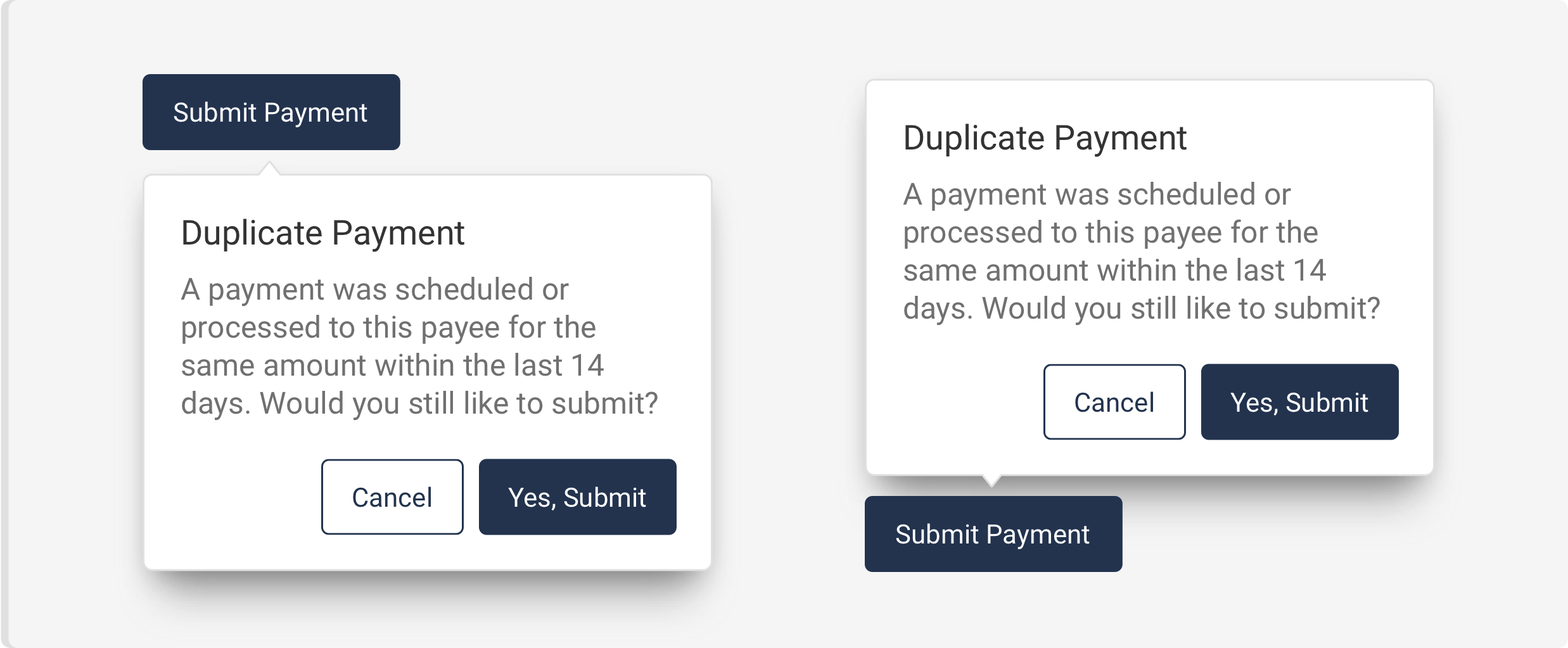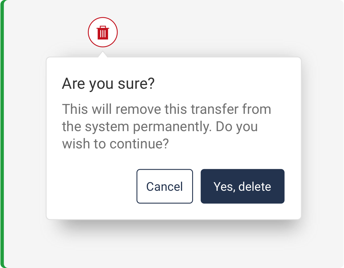 - When the user is about to delete Popovers are always actionable vs tooltips that are informational only. They appear when the user clicks and remain open until the user takes action or closes out. Use popover sparingly as they are interruptive to the user. Always allow users to click outside of popover to exit.