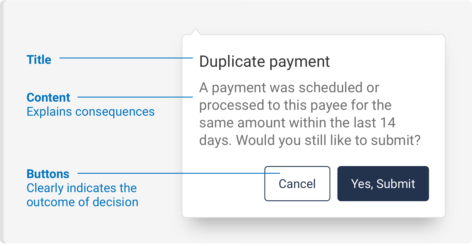 Title should be clear and concise and often asks a question. The content is short and clearly describes any risk in the action being taken by user. The buttons should have a cancel option and an affirmative action.