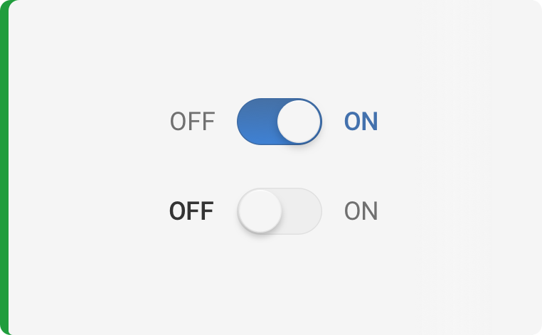 A toggle is used to quickly switch between two possible states. The action occurs immediately when user switches the toggle setting. Toggles support two simple, opposite choices. For other selection components see checkbox or radio buttons.